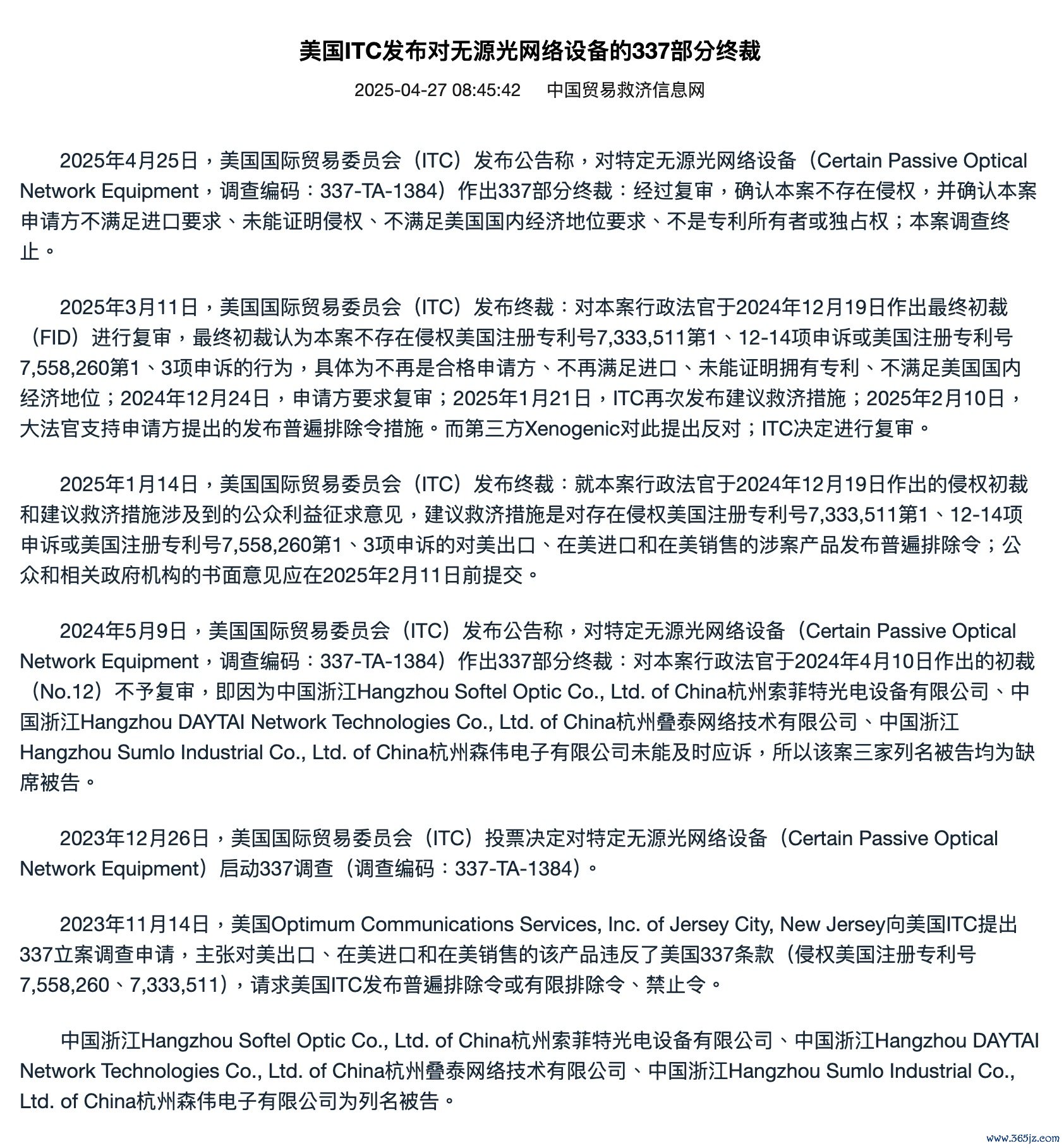 美国ITC发布对无源光网络设备的337部分终裁美国ITC发布对无源光网络设备的337部分终裁